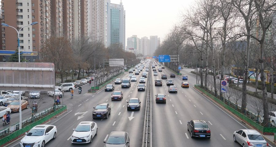 Carros percorrem nas ruas em Shijiangzhuang, na Província de Hebei, norte da China, em 1º de fevereiro de 2021. (Xinhua/Mu Yu)