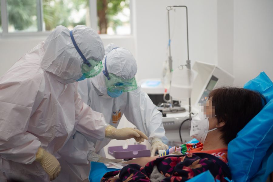 Uma paciente curada do coronavírus doa plasma no Centro de Sangue de Hainan, no sul da China, em 17 de fevereiro de 2020. Os pacientes curados são encorajados a doar plasma para ajudar a curar pacientes infectados em condições graves e críticas.