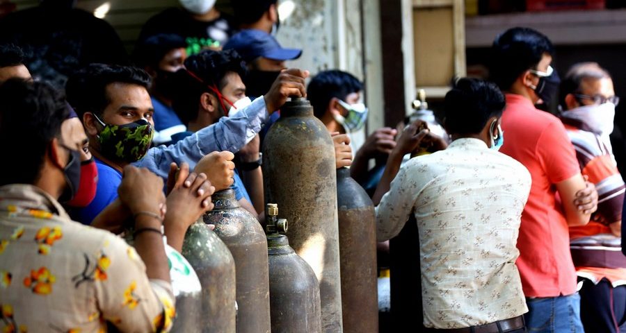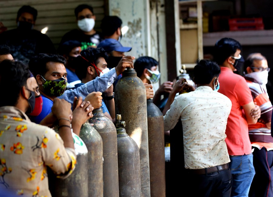 As pessoas esperam na fila para encher cilindros de oxigênio médico vazios para pacientes de COVID-19 em frente a uma loja em Nova Déli, Índia, em 26 de abril de 2021. (Xinhua/Partha Sarkar)