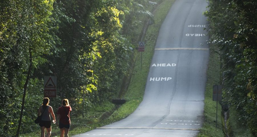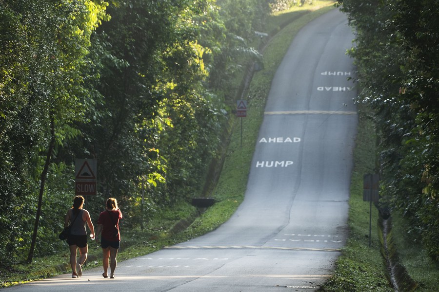 Pessoas caminham na rua dentro da floresta da Central Catchment Nature Reserve de Cingapura, em 21 de abril de 2021. (Then Chih Wey/Xinhua)