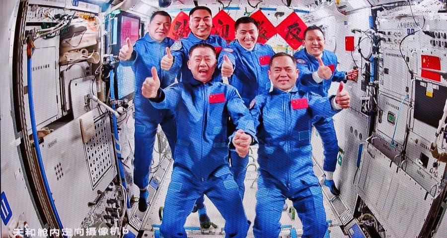 (251101) -- BEIJING, Nov. 1, 2025 (Xinhua) -- This image captured at Beijing Aerospace Control Center on Nov. 1, 2025 shows a group picture of the crew of Shenzhou-20 and Shenzhou-21 spaceships. The three astronauts aboard China's Shenzhou-21 spaceship have entered the country's space station and met with another astronaut trio early Saturday morning, starting a new round of in-orbit crew handover. The six crew members then took group pictures for the seventh space get-together in China's aerospace history. They will live and work together for about five days to complete planned tasks and handover work, according to the China Manned Space Agency (CMSA). (Xinhua/Jin Liwang)
