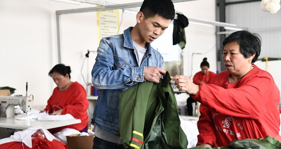 Jiang Biao (à esquerda) verifica a qualidade das roupas na empresa de roupas Chaoyang, na vila de Daji no distrito de Caoxian, Província de Shandong, leste da China, em 27 de março de 2018. (Xinhua/Guo Xulei)