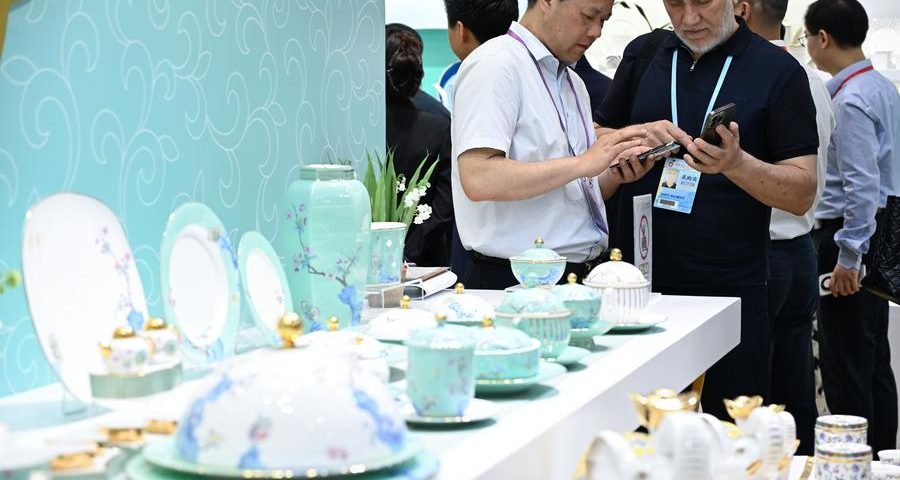 (250423) -- GUANGZHOU, April 23, 2025 (Xinhua) -- An overseas buyer visits a porcelain area of the 137th China Import and Export Fair in Guangzhou, south China's Guangdong Province, April 23, 2025. The second phase of the 137th China Import and Export Fair, also known as Canton Fair, focusing on quality home furnishings, opened on Wednesday with more than 10,000 exhibiting companies. (Xinhua/Deng Hua)