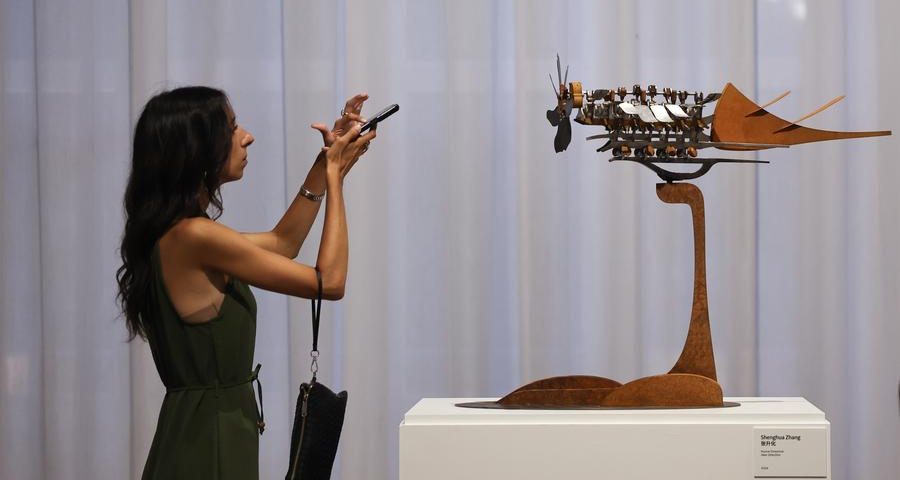 Visitante observa exibição na “Exposição Diálogo Internacional do Oriente e Ocidente 2025: De Shanghai a Roma”, na Galeria Nacional de Arte Moderna e Contemporânea em Roma, Itália, em 14 de julho de 2025. (Xinhua/Li Jing)
