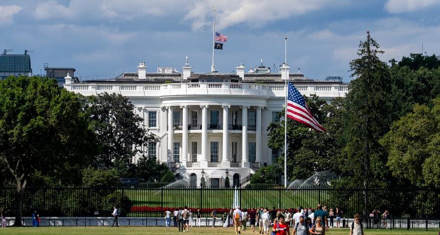 (250827) -- WASHINGTON, Aug. 27, 2025 (Xinhua) -- The U.S. flag flies at half-staff at the White House in Washington D.C., the United States, Aug. 27, 2025. A shooting occurred Wednesday morning at Annunciation Catholic School in the city of Minneapolis, the U.S. state of Minnesota, killing an 8-year-old and a 10-year-old and injuring 17 others, police confirmed. Hours after the shooting, U.S. President Donald Trump signed a proclamation lowering the flags to half-staff in honor of the victims. (Xinhua/Hu Yousong)