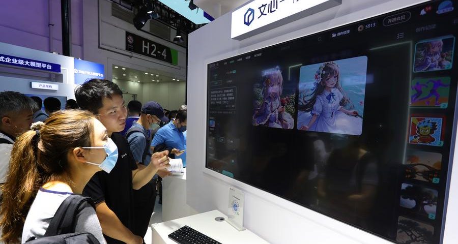(231223) -- BEIJING, Dec. 23, 2023 (Xinhua) -- A visitor learns about an app from Baidu during the World Artificial Intelligence Conference (WAIC) 2023 in Shanghai, east China, July 6, 2023. (Xinhua/Fang Zhe)
