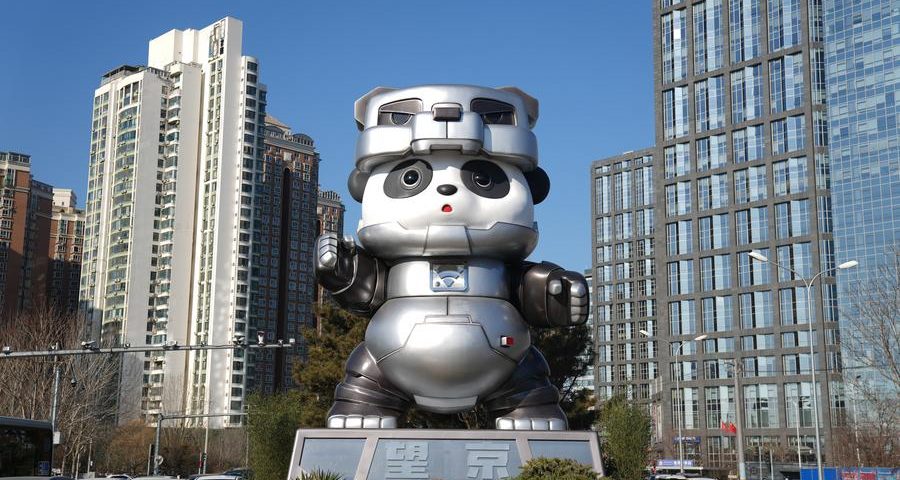(220102) -- BEIJING, Jan. 2, 2022 (Xinhua) -- Photo taken on Jan. 2, 2022 shows a giant panda art installation in the Wangjing subdistrict of Chaoyang District in Beijing, capital of China. The brand-new stainless steel art installation, which is 10.5 meters in height, was unveiled on Saturday. (Xinhua/Peng Ziyang)
