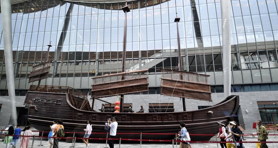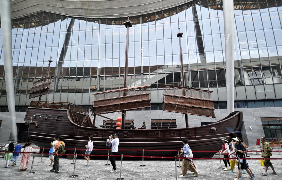 (250816) -- BEIJING, Aug. 16, 2025 (Xinhua) -- People visit the Grand Canal Museum of Beijing in Tongzhou District of Beijing, capital of China, Aug. 15, 2025. Connecting Beijing and Hangzhou in east China's Zhejiang Province, the Grand Canal is the world's longest artificial waterway. In recent years, Beijing has implemented an array of measures in the protection of the environment in and along the Grand Canal, which has lead to improved water quality, restored biodiversity as well as enhanced vegetation coverage. (Xinhua/Li Xin)