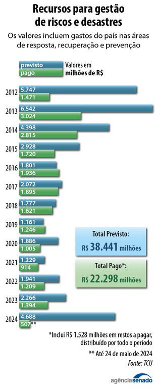 No total de 13 anos (2012-2024), foram previstos R$ 38,44 bilhões e pagos R$ 22,29 bilhões, incluindo R$ 1,52 bilhão de restos a pagar — despesas empenhadas mas não pagas até o dia 31 de dezembro de cada ano — distribuídos por todo o período. Os valores pagos em 2024 alcançam apenas os meses completos de janeiro a abril e o mês de maio até o dia 24.