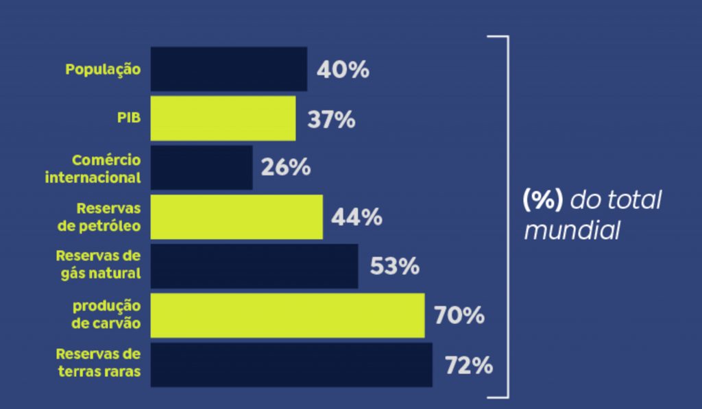 Setenta e dois por cento das reservas mundiais de terras raras estão nesses dez territórios, assim como 70% da produção global de carvão mineral. Rússia e Brasil detêm as maiores reservas de água doce do planeta.