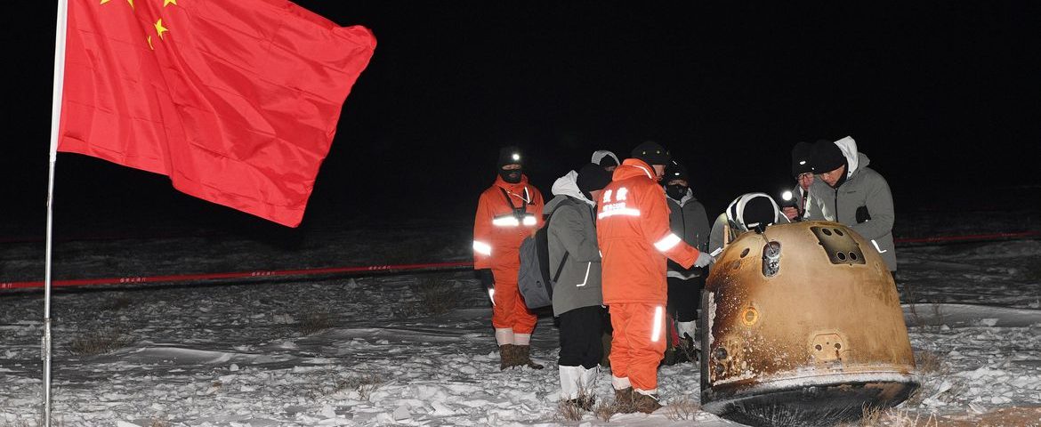 A cápsula da sonda Chang e-5 pousou por volta das 18h de quarta-feira em Lisboa, no distrito de Siziwang, na região da Mongólia Interior.