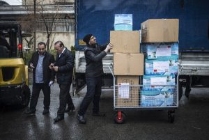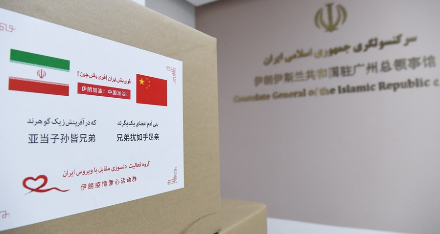 Funcionários do Ministério da Saúde e Educação Médica do Irã organizam caixas de máscaras doadas pela China em Teerã, Irã, em 25 de fevereiro de 2020. (Ahmad Halabisaz/Xinhua)