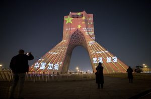 A Torre Azadi está iluminada em Teerã, Irã, em 18 de fevereiro de 2020, para mostrar apoio à cidade atingida pela epidemia, Wuhan, no centro da China. (Ahmad Halabisaz/Xinhua)