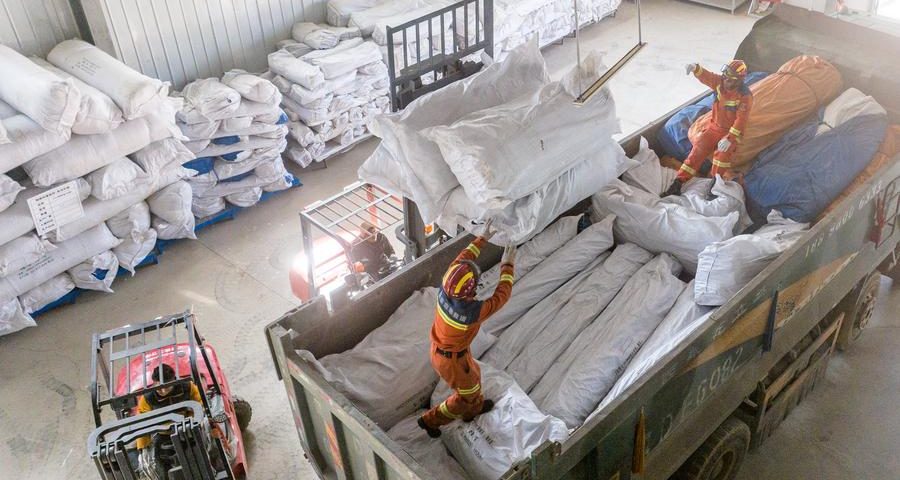 (250116) -- DINGRI, Jan. 16, 2025 (Xinhua) -- An aerial drone photo shows disaster relief support team members loading supplies onto a vehicle at a warehouse in Dingri County in Xigaze, southwest China's Xizang Autonomous Region, Jan. 15, 2025. The disaster relief work in quake-hit Dingri County including makeshift houses construction, supply transportation and debris removal work have been accelerated to better meet the needs and improve the living conditions of the residents. (Xinhua/Tenzin Nyida)