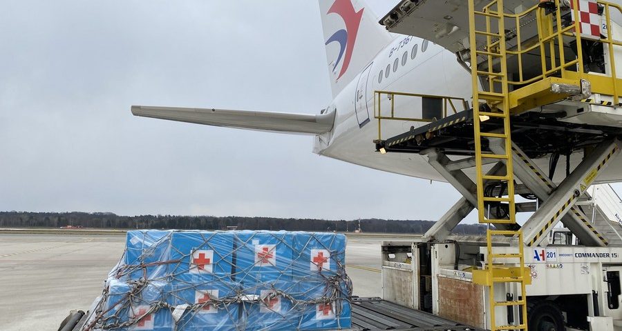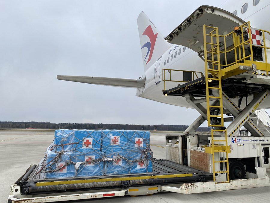 Suprimentos médicos que vêm junto com a terceira equipe médica chinesa são descarregados do avião no Aeroporto Malpensa de Milão, em Milão, Itália, em 25 de março de 2020. (Str/Xinhua)