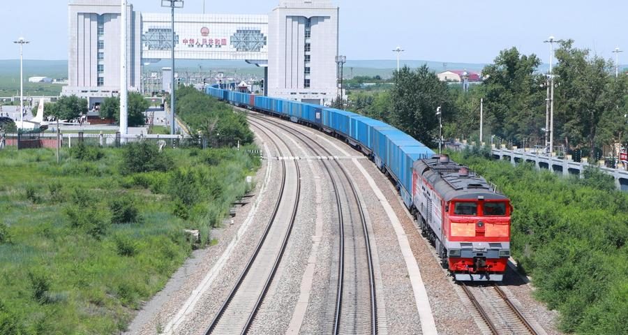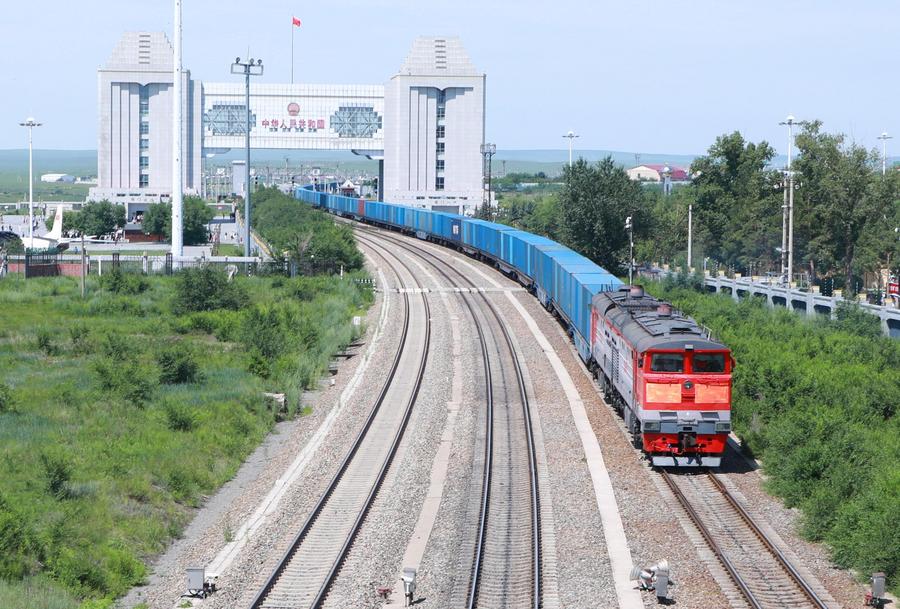 (250725) -- MANZHOULI, July 25, 2025 (Xinhua) -- This photo taken on July 24, 2025 shows a freight train loaded with goods arriving at the railway station in Manzhouli, north China's Inner Mongolia Autonomous Region. The Manzhouli railway port, China's largest land port, has handled 30,000 China-Europe freight train trips and nearly 3 million TEUs (twenty-foot equivalent units) of goods since 2013. (Photo by Huang Xu/Xinhua)