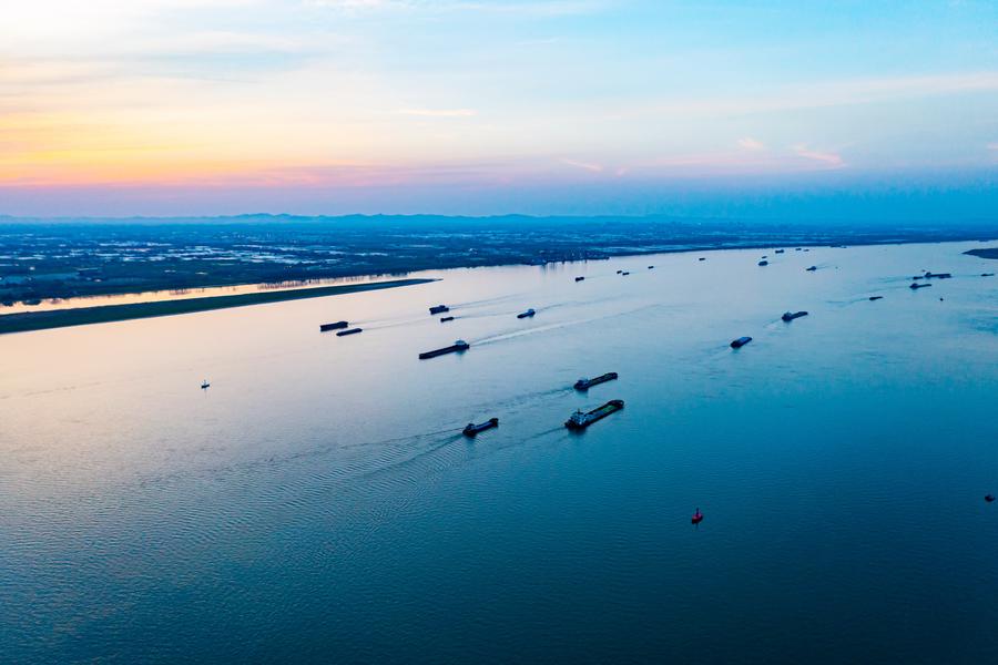 (240614) -- BEIJING, June 14, 2024 (Xinhua) -- An aerial drone photo taken on March 30, 2024 shows the view of the Yangtze River in the Ma'anshan section of China's Anhui Province. In recent years, provinces in China's central region have been making great efforts in the protection of water resources, so as to strengthen the shields for ecological security and protect biodiversity along the Yangtze River. (Photo by Chen Liang/Xinhua)