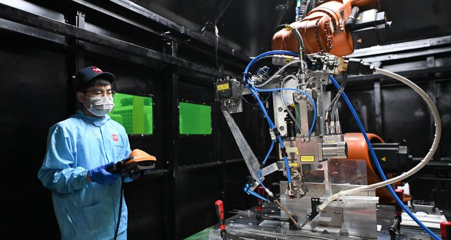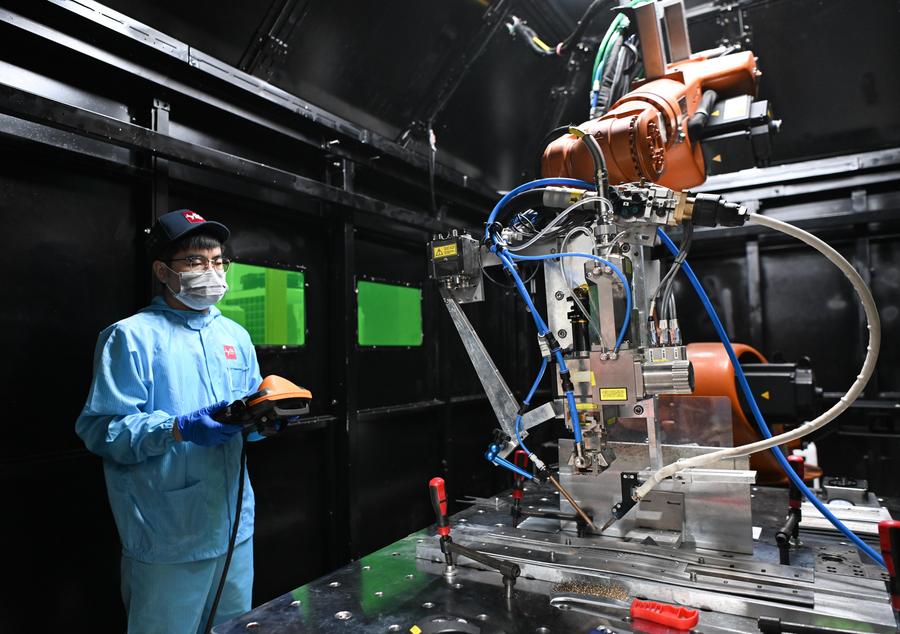 (250630) -- GUANGZHOU, June 30, 2025 (Xinhua) -- A staff member sets parameters before welding at Guangdong Lyric Robot Automation Co., Ltd. in Huizhou, south China's Guangdong Province, June 27, 2025. Guangdong Province has been bolstering its pivot cities including Guangzhou, Shenzhen, Foshan and Dongguan to engage in manufacturing intelligent equipment, an effort to build an industrial cluster for manufacturing high-end equipment. In 2024, the province's operating revenue from the high-end equipment manufacturing reached 390.565 billion yuan (54.5 billion U.S. dollars) with the total profit standing at 18.873 billion yuan (2.63 billion U.S. dollars). (Xinhua/Deng Hua)