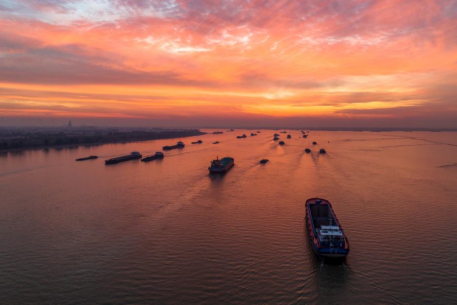 (240206) -- WUHU, Feb. 6, 2024 (Xinhua) -- An aerial drone photo taken on Dec. 5, 2023 shows a scenery of the Yangtze river in Wuhu, east China's Anhui Province. In recent years, Wuhu City in Anhui Province has made continuous efforts to restore the ecological environment of the Yangtze River. Greenways and recreational platforms have been built along the river, attracting many local residents. (Photo by Xiao Benxiang/Xinhua)