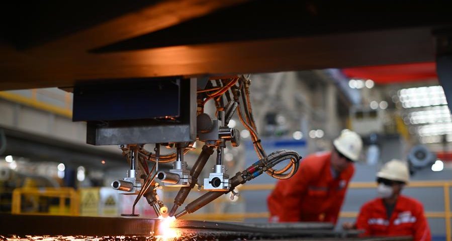 (241030) -- TIANJIN, Oct. 30, 2024 (Xinhua) -- Staff members debug a digital plate-cutting machine at a pipeline workshop of an intelligent manufacturing base under China Offshore Oil Engineering Company in north China's Tianjin, on Oct. 30, 2024. China's first intelligent manufacturing base for offshore oil and gas equipment was put into full operation on Wednesday in north China's Tianjin Municipality. Covering an area of about 575,000 square meters, this base built along the coast of the Bohai Sea focuses on producing offshore oil and gas platforms and high-end offshore products such as liquefied natural gas modules, according to its constructor China Offshore Oil Engineering Company (COOEC), a subsidiary of the China National Offshore Oil Corporation. The base consists of four intelligent production workshops, eight production auxiliary centers, 16 final assembly stations and core facilities such as docks facilitating product transportation via large ships. There are also over 600 intelligent production machines at this base. The base was constructed in two phases. The first phase of the project was put into use in June 2022, and delivered 35 offshore oil and gas platforms to countries such as China and Canada, with total weight exceeding 87,000 tonnes. (Xinhua/Zhao Zishuo)
