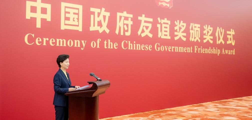 A Conselheira do Estado Chinês, Shen Yiqin, entregou o Prêmio de Amizade aos homenageados, comprometendo-se em fornecer um palco amplo e mais conveniência para os especialistas estrangeiros que trabalham e vivem na China.