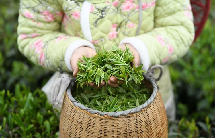 (240405) -- YUQING(GUIZHOU), April 5, 2024 (Xinhua) -- A farmer shows fresh tea leaves at a tea garden in Erlong Village in Yuqing County, southwest China's Guizhou Province, April 5, 2024. During the Qingming Festival, tea farmers are engaged in the bustling activity of harvesting and processing spring tea in Yuqing County. In recent years, Yuqing County has strategically positioned the tea industry as its pillar industry. Measures such as expanding cultivation areas, introducing processing enterprises, and extending the industry chain have been implemented to drive rural revitalization. The efforts have yielded significant results, with the total area of tea plantations in Yuqing County now reaching 213,000 mu (approximately 14,200 hectares). More than 80,000 villagers have directly benefited from tea-related businesses with income increased. (Photo by Wang Chao/Xinhua)