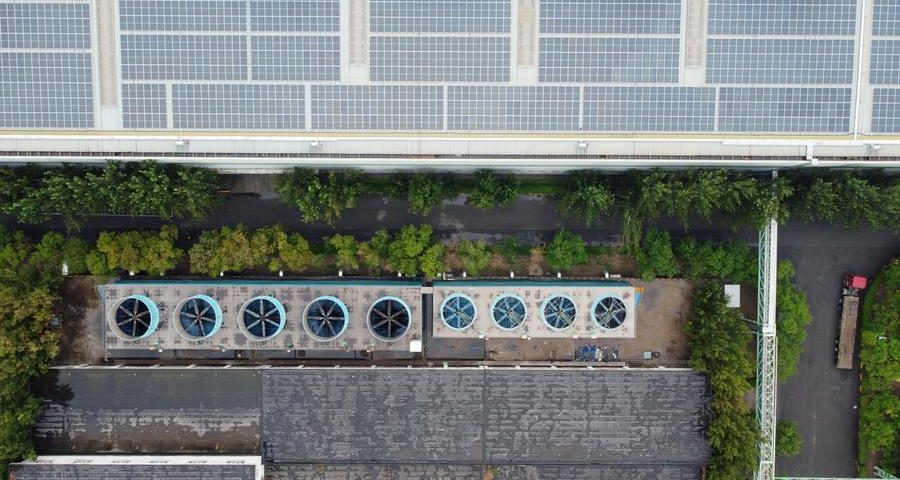 (230714) -- TIANJIN, July 14, 2023 (Xinhua) -- This aerial photo taken on July 12, 2023 shows solar panels on the roof of a workshop of the New Tianjin Steel Group in Tianjin, north China. To achieve carbon reduction and improve energy efficiency, Tianjin has pushed forward the comprehensive transformation of its iron and steel industry chain in recent years. Iron and steel producers are encouraged to reform their energy mix, upgrade technology and develop hydrogen-fuelled transportation. The iron and steel enterprises still in operation in Tianjin have all completed the ultra-low emission transformation. As a result, the energy consumption per unit of the increased value of industrial enterprises above designated size is in steady decline. (Xinhua/Zhao Zishuo)