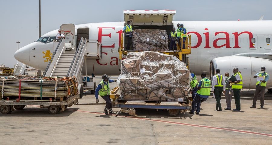 Funcionários descarregam doações da Fundação Jack Ma e Fundação Alibaba no Aeroporto Internacional Blaise Diagne em Dakar, Senegal, em 28 de março de 2020. (Eddy Peters/Xinhua)