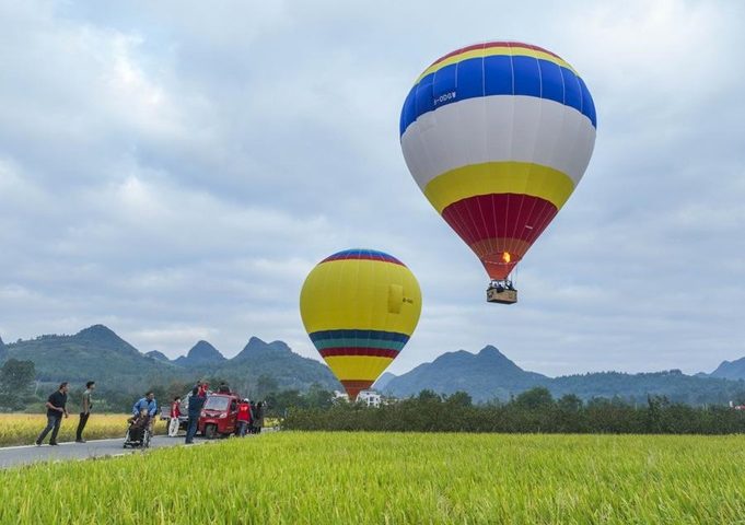 (241006) -- NINGYUAN, Oct. 6, 2024 (Xinhua) -- A drone photo taken on Oct. 6, 2024 shows tourists taking hot air balloons for sightseeing in Wanjing Town of Ningyuan County, central China's Hunan Province. During the week-long National Day holiday starting on Oct. 1, Chinese people take a break to travel and enjoy leisure activities. People's increasing strong demand for diversified vacation options has given rise to more abundant and diverse cultural and tourism products in the tourism market during the holiday. (Photo by Jiang Keqing/Xinhua)