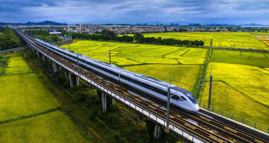 (240217) -- GUANGZHOU, Feb. 17, 2024 (Xinhua) -- An aerial drone photo taken on June 4, 2023 shows a bullet train running through paddy fields in Zhongshan, south China's Guangdong Province. The Guangdong-Hong Kong-Macao Greater Bay Area, a city cluster, is one of the most open areas in China with economic vitality. The greater bay area is composed of nine cities in Guangdong Province including Guangzhou, Shenzhen, Zhuhai, Foshan, Huizhou, Dongguan, Zhongshan, Jiangmen and Zhaoqing, and two special administrative regions of Hong Kong and Macao. (Photo by Zhang Jianlai/Xinhua)