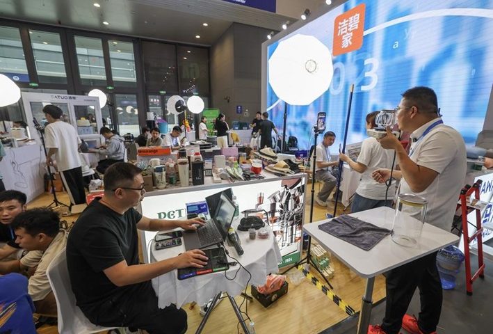 (240925) -- HANGZHOU, Sept. 25, 2024 (Xinhua) -- Staff members promote products via livestreaming at the Silk Road E-commerce Zone during the third Global Digital Trade Expo in Hangzhou, east China's Zhejiang Province, Sept. 25, 2024. The third Global Digital Trade Expo opened in Hangzhou on Wednesday, showcasing the latest technological innovations and business development of the digital economy sector. Themed "Digital Trade, Global Access," this year's edition has attracted more than 1,500 enterprises from home and abroad, among which over 300 are international companies. Over 30,000 purchasers have signed up for the event, with more than 6,000 of them from foreign countries and regions. (Xinhua/Xu Yu)