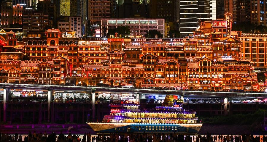 (250609) -- CHONGQING, June 9, 2025 (Xinhua) -- Tourists take a cruise ship to enjoy the night view in southwest China's Chongqing Municipality, May 28, 2025. In recent years, Chongqing has made efforts to enrich its consumption forms in line with its existing tourism resources, as a way to provide better consumption experience for customers and unleash market potential. (Xinhua/Wang Quanchao)