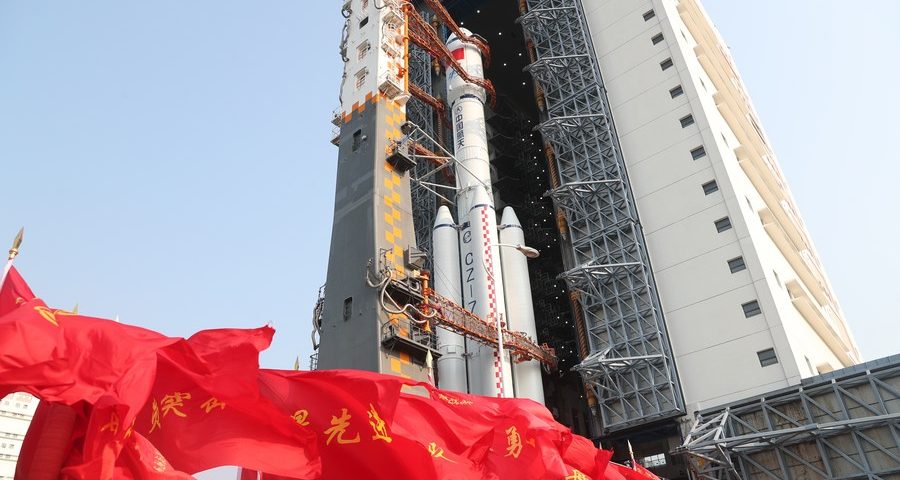 Wenchang, Hainan – A combinação da espaçonave de carga Tianzhou-6 e um foguete transportador Longa Marcha-7 Y7 foi transferida para a posição vertical na área de lançamento neste domingo.