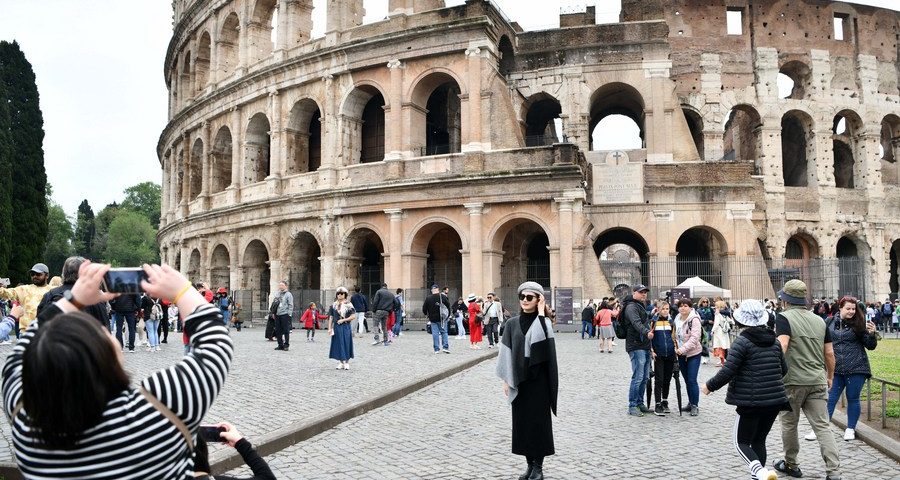Turista chinesa posa para fotos em frente ao Coliseu em Roma, Itália, em 1º de maio de 2023. Foto: Jin Mamengni