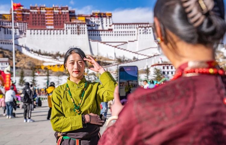 (240211) -- LHASA, Feb. 11, 2024 (Xinhua) -- A tourist poses for photos in front of the Potala Palace in Lhasa, southwest China's Xizang Autonomous Region, Feb. 11, 2024. Iconic tourist destinations in Xizang, such as Potala Palace, have been open to the public free of charge until March 15 of 2024, as part of the region's winter tourism promotion. During the winter promotion period, all scenic spots rated above A level in Xizang are open to the public free of charge, except for temple sites. (Xinhua/Sun Fei)