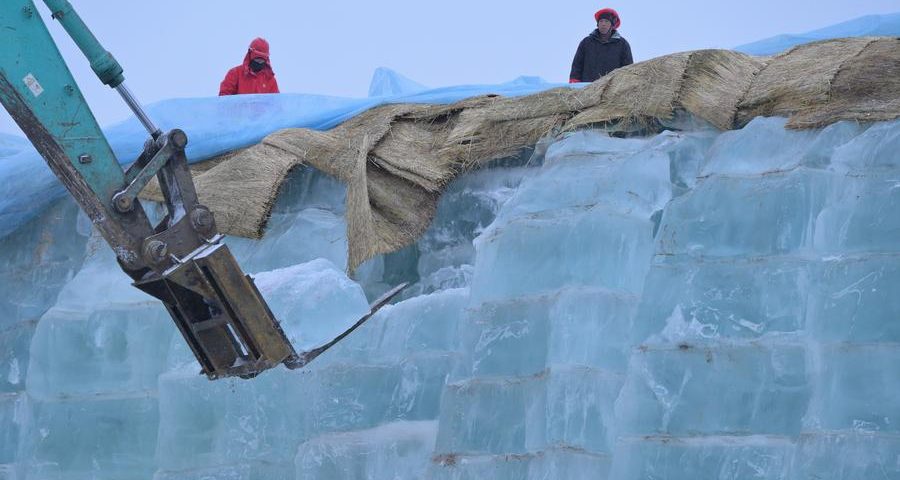 Harbi – A construção do Mundo de Gelo e Neve em Harbin, na capital da Província de Heilongjiang, nordeste da China, começou na quarta-feira, com blocos de gelo transportados para o parque depois de serem armazenados por mais de 10 meses.