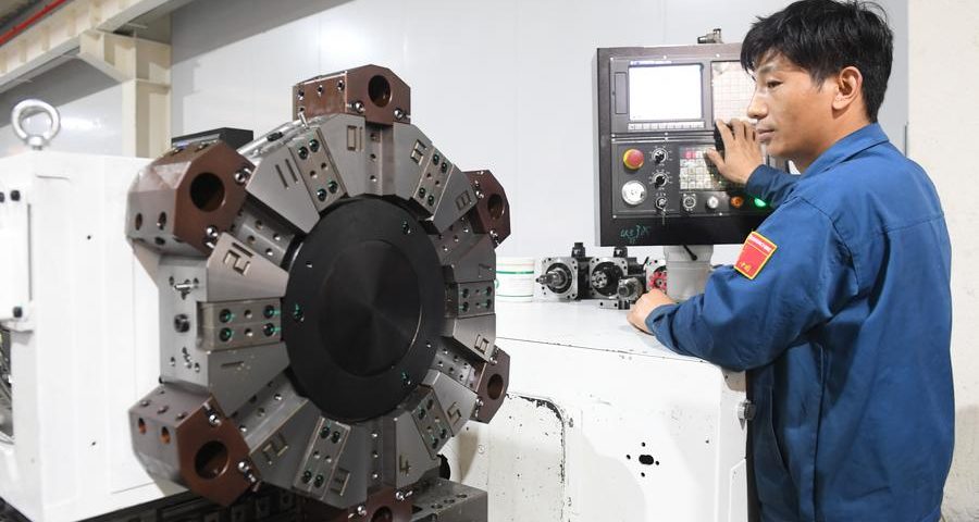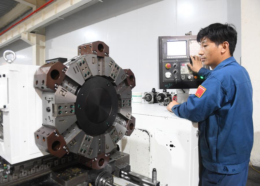 (240301) -- TAIZHOU, March 1, 2024 (Xinhua) -- A staff member checks testing data of a knife tower produced at Taizhou Eastern CNC Technology Co., Ltd. in Wenling, Taizhou, east China's Zhejiang Province, Feb. 29, 2024. Private firms account for more than 99 percent of all enterprises in Taizhou, where the local authorities have continuously implemented diversified measures in recent years to promote high-quality development of the private economy. In 2023 alone, the city recorded an industrial added value of 222.994 billion yuan (about 30.98 billion U.S. dollars), with new energy, high-tech and strategic emerging industries becoming the new propellers of its industrial development. (Xinhua/Weng Xinyang)