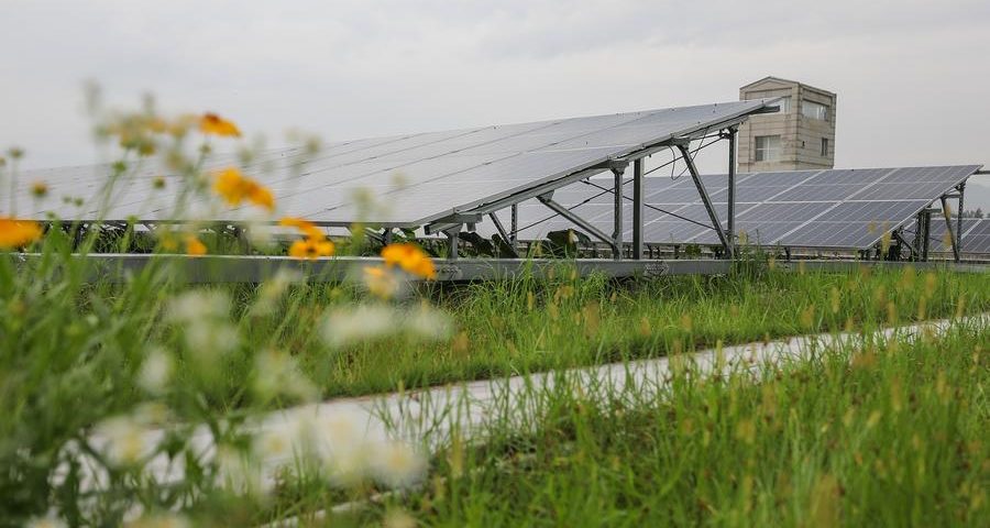 (240629) -- NANCHANG, June 29, 2024 (Xinhua) -- This photo taken on June 28, 2024 shows photovoltaic panels on the roof of a workshop at the Jiangzhong medicine valley in Nanchang, east China's Jiangxi Province. As the core production base of CR Jiangzhong, Jiangzhong medicine valley has been committed to sustainable growth in recent years by retaining original vegetation, reducing energy consumption, recycling liquid and solid wastes, and tapping on renewable energy. (Xinhua/Du Xiaoyi)
