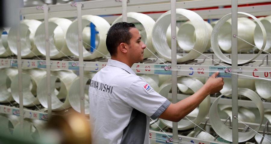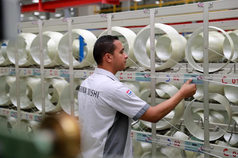 (230821) -- CAIRO, Aug. 21, 2023 (Xinhua) -- Ahmed Soliman, deputy general manager of Jushi Egypt Fiberglass Co., Ltd., checks on the fiberglass production line of Jushi Egypt at the China-Egypt TEDA Suez Economic and Trade Cooperation Zone in Suez province, Egypt, Aug. 10, 2023. TO GO WITH "Explainer: How a joint economic and trade cooperation zone connects the Bohai and Red seas" (Xinhua/Sui Xiankai)