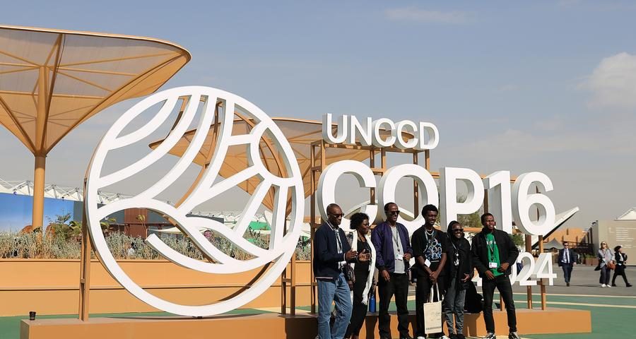 (241203) -- RIYADH, Dec. 3, 2024 (Xinhua) -- People pose for photos in front of an installation of the 16th Conference of the Parties (COP16) to the United Nations Convention to Combat Desertification (UNCCD) in Riyadh, Saudi Arabia, on Dec. 3, 2024. COP16, held from Dec. 2 to 13 under the theme "Our Land. Our Future," is the largest UN land-focused conference to date and the first UNCCD COP in the Middle East and North Africa. Delegates are expected to make decisions on collective actions aimed at accelerating land restoration, improving resilience to droughts and sandstorms, restoring soil health, and scaling up nature-positive food production, with a focus on 2030 and beyond. (Xinhua/Wang Dongzhen)
