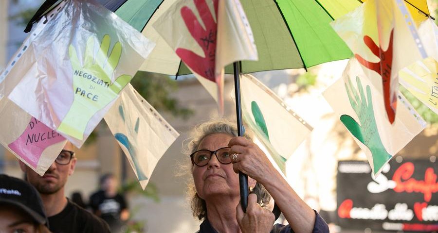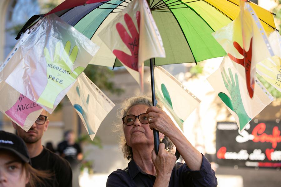 (240615) -- FASANO, June 15, 2024 (Xinhua) -- A woman protests during an anti-G7 manifestation at Fasano, Apulia in southern Italy, June 14, 2024. TO GO WITH "Feature: Protests against G7 held, highlighting social justice, global peace" (Xinhua/Li Jing)