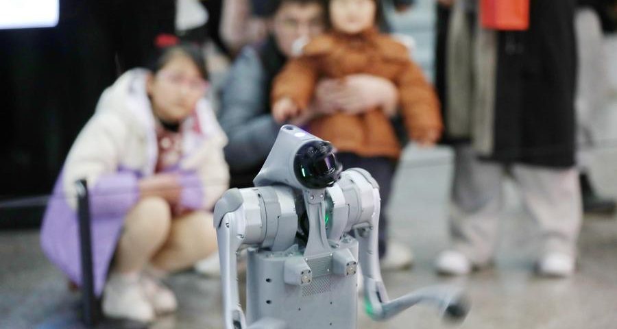 (250131) -- BEIJING, Jan. 31, 2025 (Xinhua) -- Visitors watch a performance made by a robot dog at the science and technology museum in Jiaxing City, east China's Zhejiang Province, Jan. 31, 2025. People enjoy various activities to celebrate the Chinese New Year which falls on Jan. 29 this year. (Photo by Jin Peng/Xinhua)