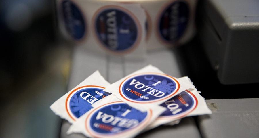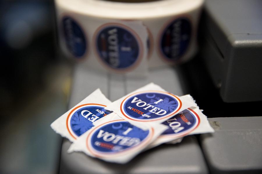 (240204) -- WASHINGTON, Feb. 4, 2024 (Xinhua) -- Voting souvenir stickers are seen at a polling station during the South Carolina Democratic presidential primary in Charleston, South Carolina, the United States, Feb. 3, 2024. Multiple U.S. media organizations on Saturday night projected that President Joe Biden has won the 2024 South Carolina Democratic presidential primary, the first official primary for the party. (Photo by Andrew Whitaker/Xinhua)