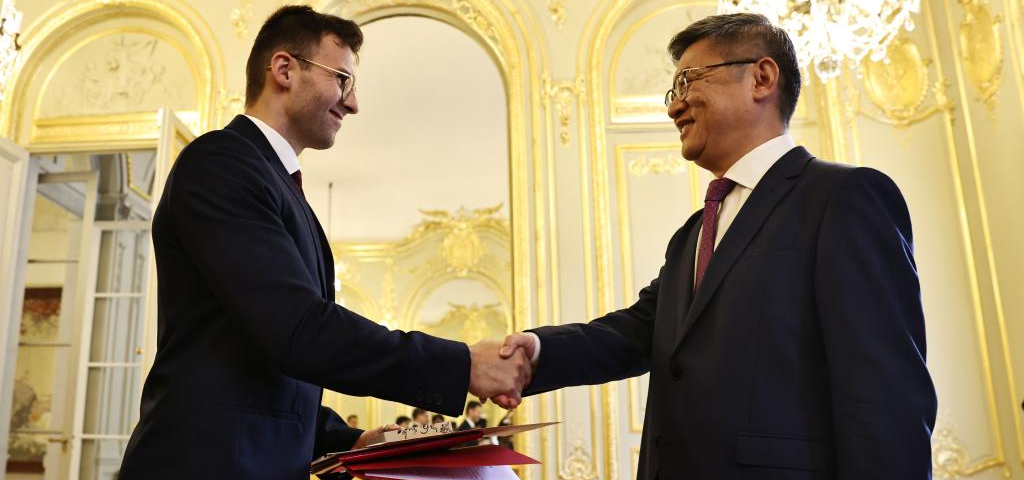 Foto tirada em 4 de agosto de 2025 mostra cerimônia de entrega de fotos históricas tiradas na Guerra de Resistência do Povo Chinês contra a Agressão Japonesa, doadas por Marcus Detrez (3º à esquerda), na Embaixada da China em Paris, França, em 4 de agosto de 2025. Uma cerimônia de entrega de fotos históricas tiradas na Guerra de Resistência do Povo Chinês contra a Agressão Japonesa, doadas por Marcus Detrez, foi realizada na Embaixada da China na França na noite de segunda-feira. Durante o evento, Chen Dong, ministro da Embaixada da China na França, entregou a Detrez um certificado de doação e uma carta de agradecimento do Salão Memorial de Songhu em Shanghai para a Guerra de Resistência contra a Agressão Japonesa, que doou 618 fotografias históricas colecionadas por seu avô, Roger-Pierre Laurens. (Xinhua/Gao Jing)
