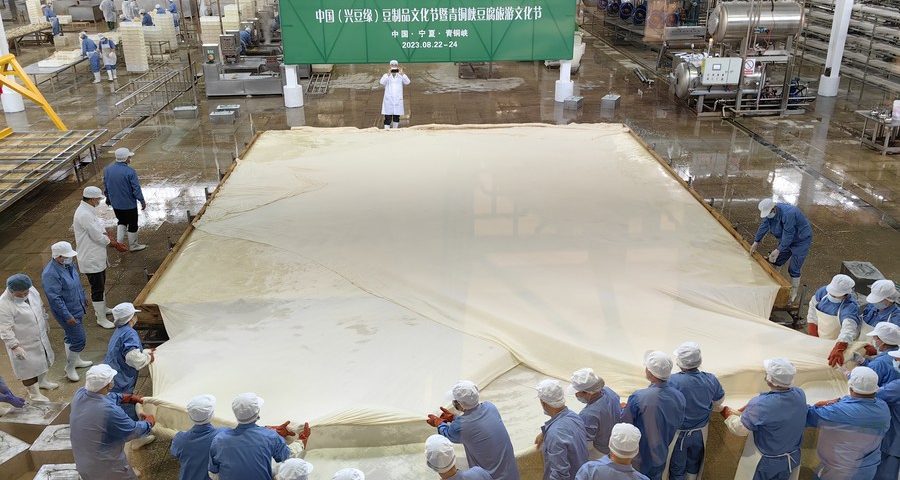 Yinchuan – Com um tamanho impressionante de 8 metros de comprimento, 8 metros de largura e 17 centímetros de altura, o maior pedaço de tofu na China foi produzido na quarta-feira por uma empresa na Região Autônoma da Etnia Hui de Ningxia.