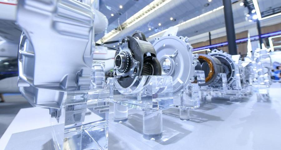 (240902) -- YIBIN, Sept. 2, 2024 (Xinhua) -- This photo taken on Sept. 1, 2024 shows a dual-motor drive system for the new energy vehicle (NEV) in Yibin, southwest China's Sichuan Province. An exhibition boasting the achievements in power battery industry and supply chains was held from Aug. 31 to Sept. 2 here as a part of the 2024 World Power Battery Conference, comprehensively showcasing the innovative products and technological achievements in the industrial chain in the past year, as well as cutting-edge technological application scenarios such as power tools and low-altitude economy. The 2024 World Power Battery Conference, which opened on Sunday in the city of Yibin, southwest China's Sichuan Province, attracted nearly 400 industry experts and company executives from home and abroad. The event, hosted by the Sichuan provincial government, aims to build an international cooperation platform for the development of the power battery industry and promote the high-quality development of green and low-carbon industries. (Xinhua/Tang Wenhao)