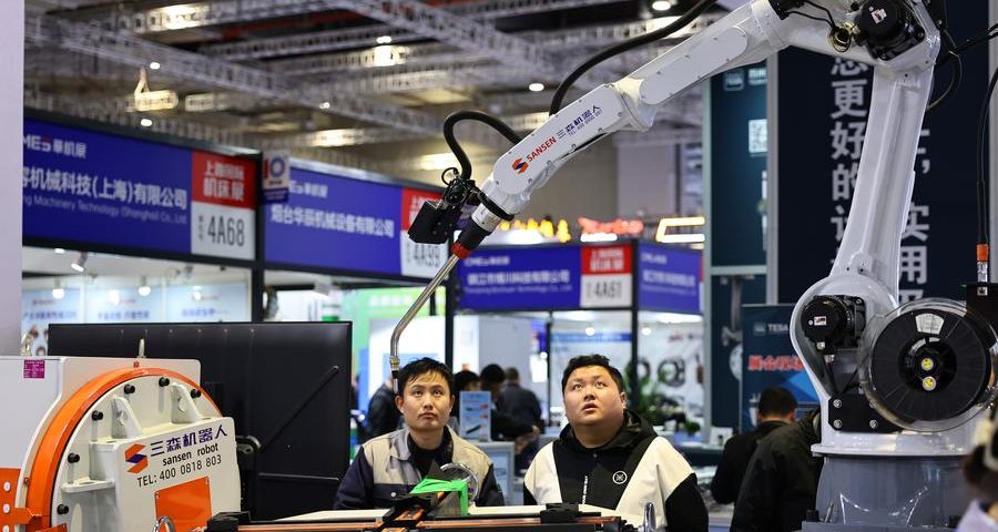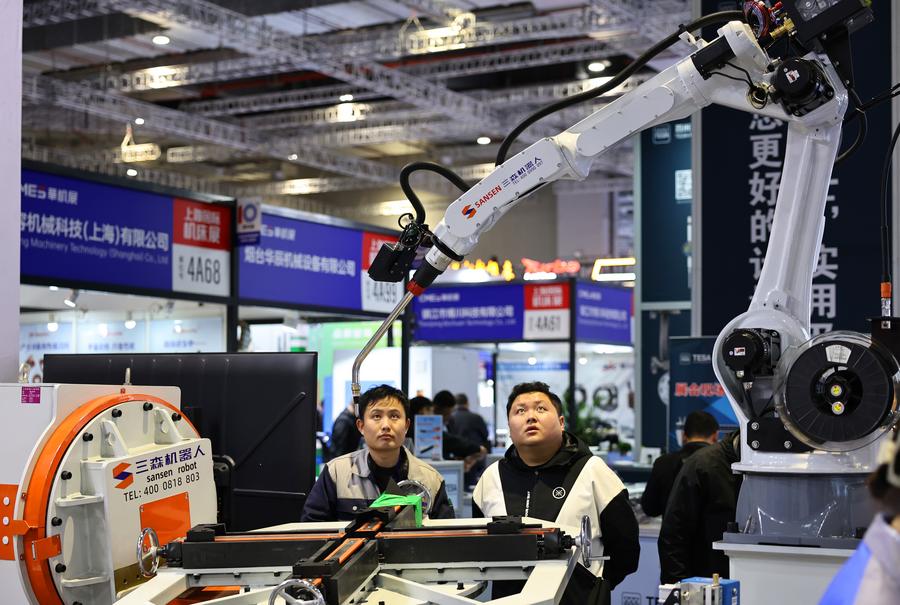 (250303) -- SHANGHAI, March 3, 2025 (Xinhua) -- Visitors watch a robot demonstration during the Shanghai International Machine Tool Exhibition in Shanghai, east China, March 3, 2025. The 2025 Shanghai International Machine Tool Exhibition kicked off on Monday at the National Exhibition and Convention Center in Shanghai. Featuring the participation of about 1,200 domestic and international enterprises from the industry, the exhibition focused on presenting processing solutions tailored for high-demand sectors like new energy vehicles, electronic equipment manufacturing, and aviation equipment. Visitors had the opportunity to explore an array of displays, highlighting core functional components of CNC machine tools, laser processing equipment, sheet metal grinding tools, as well as a variety of related products and cutting-edge technologies. (Xinhua/Fang Zhe)