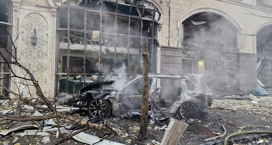 (241221) -- BEIJING, Dec. 21, 2024 (Xinhua) -- This photo taken on Dec. 20, 2024 shows the damage caused by a Russian missile and drone attack in Kiev, Ukraine. At least one person was killed and two were injured on Friday in the attack, authorities said. The Ukrainian Air Force said Russia dropped several ballistic missiles after its overnight drone strikes on Kiev. (Photo by Roman Petushkov/Xinhua)