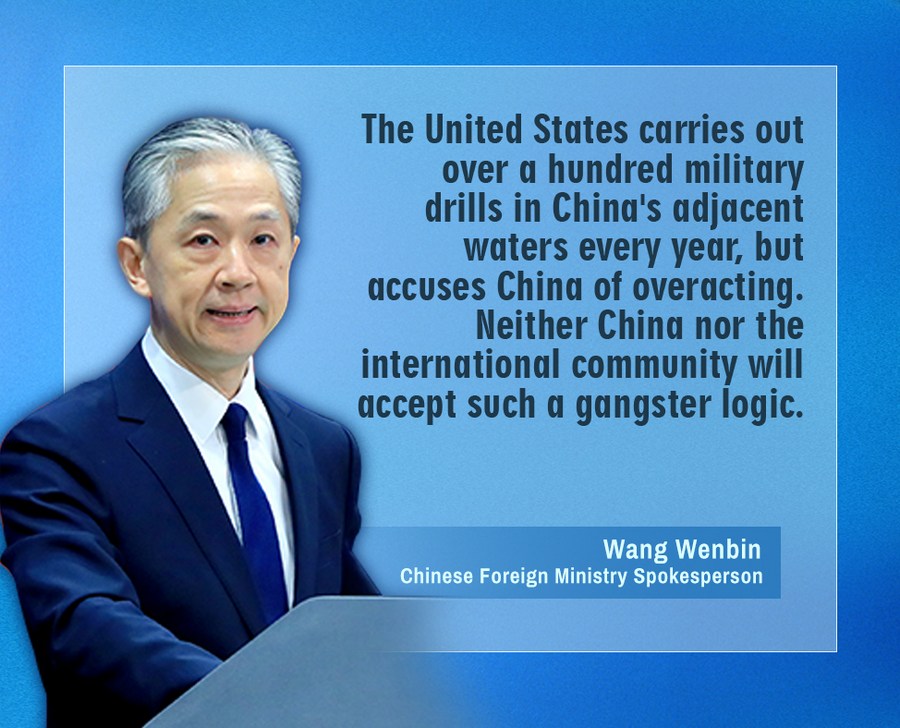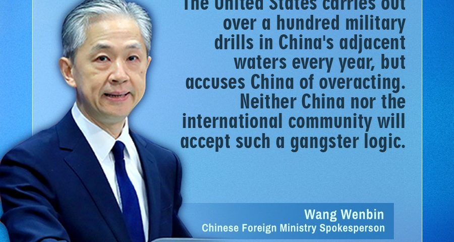 “Os Estados Unidos realizam mais de cem exercícios militares nas águas adjacentes da China todos os anos, mas acusam a China de exagerar”, acrescentou Wang, “Nem a China nem a comunidade internacional aceitarão essa lógica de gângsteres”.