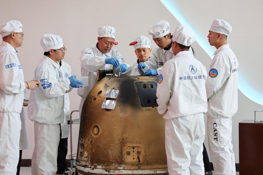 (240626) -- BEIJING, June 26, 2024 (Xinhua) -- The returner of the Chang'e-6 lunar probe is opened during a ceremony at the China Academy of Space Technology under the China Aerospace Science and Technology Corporation in Beijing, capital of China, June 26, 2024. The returner of the Chang'e-6 lunar probe was opened at a ceremony in Beijing on Wednesday afternoon. During the ceremony at the China Academy of Space Technology under the China Aerospace Science and Technology Corporation, researchers opened the returner and examined key technical indicators. (Xinhua/Jin Liwang)
